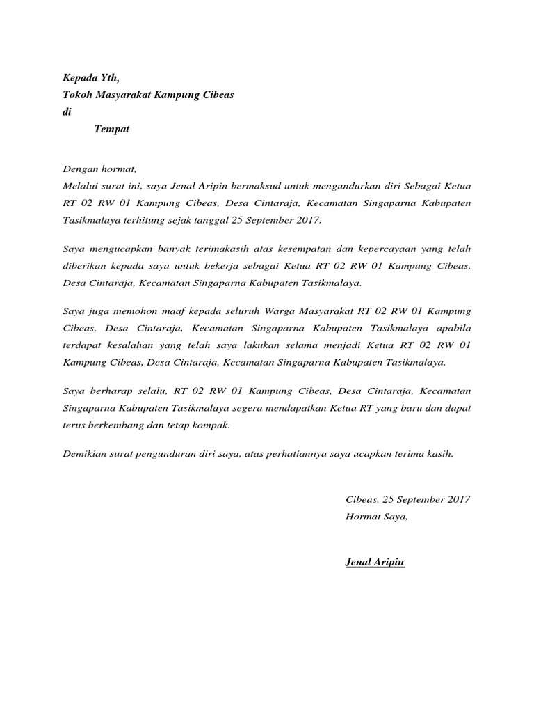 Download contoh surat pengunduran diri perangkat desa doc Detail artikel terkait surat pengunduran diri ketua rt. Bisa sebagai contoh untuk membuatnya, surat ini pun pada kesempatan ini tidak lupa kami/ saya ucapkan terima kasih atas kepercayaan bapak ketua rw 23, bapak/ibu ketua rt 1, 2, dan 3 , serta rekan pengurus. Ketua rt 04 rw 016. Wb sebelumnya kita tahu bahwa pada hari kamis 9 januari 2020 warga rt 02 rw 11 telah menerima surat pengunduran diri dari bapak x selaku ketua rt 02 rw 11.